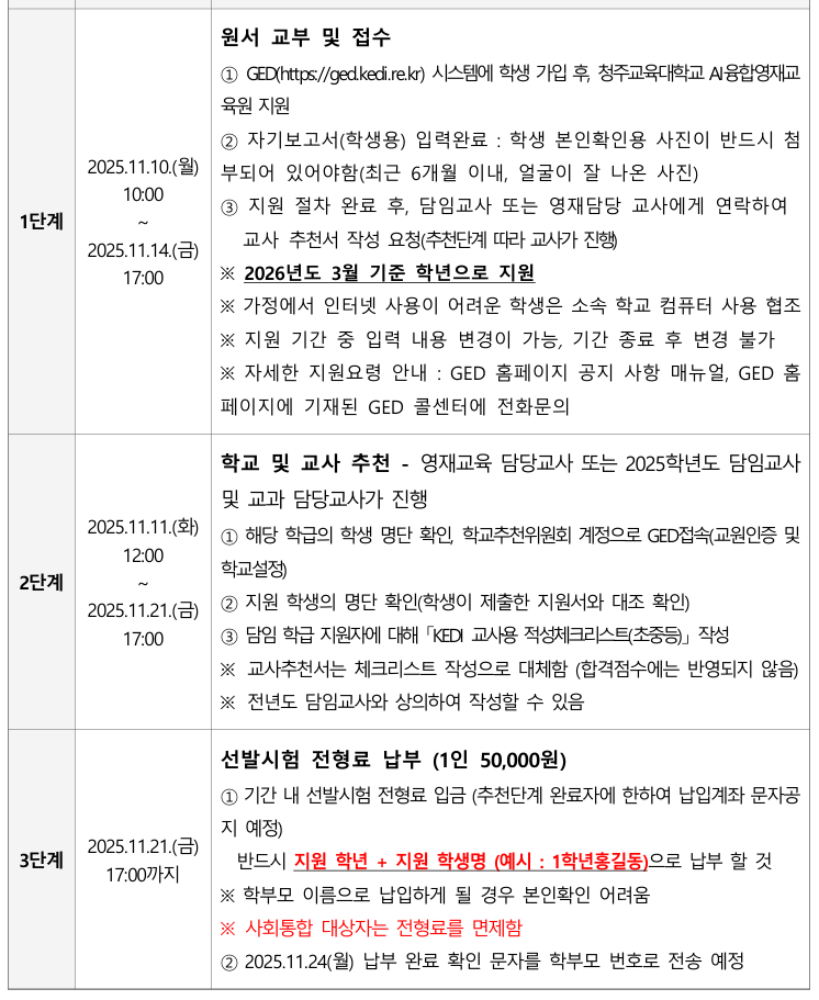| 청주교대AI영재원 (GED를 통한 다른 영재지원도 동일) | 충북대과학영재원 |