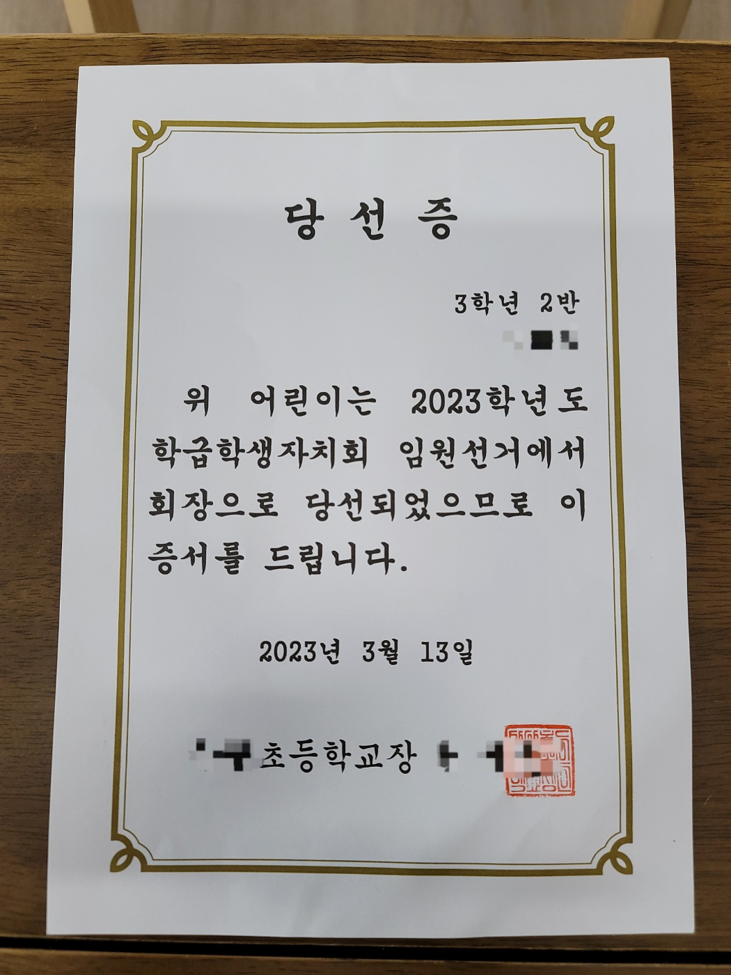 어디서나 볼 수 있는 '반장'이라는 어감 때문인지 크게 생각하지 않았는데 당선되어 받아 온 당선증에 '학급학생자치회의 회장' 이라고 쓰여 있으니 뭔가 더 무게감이 있게 느껴졌어요.