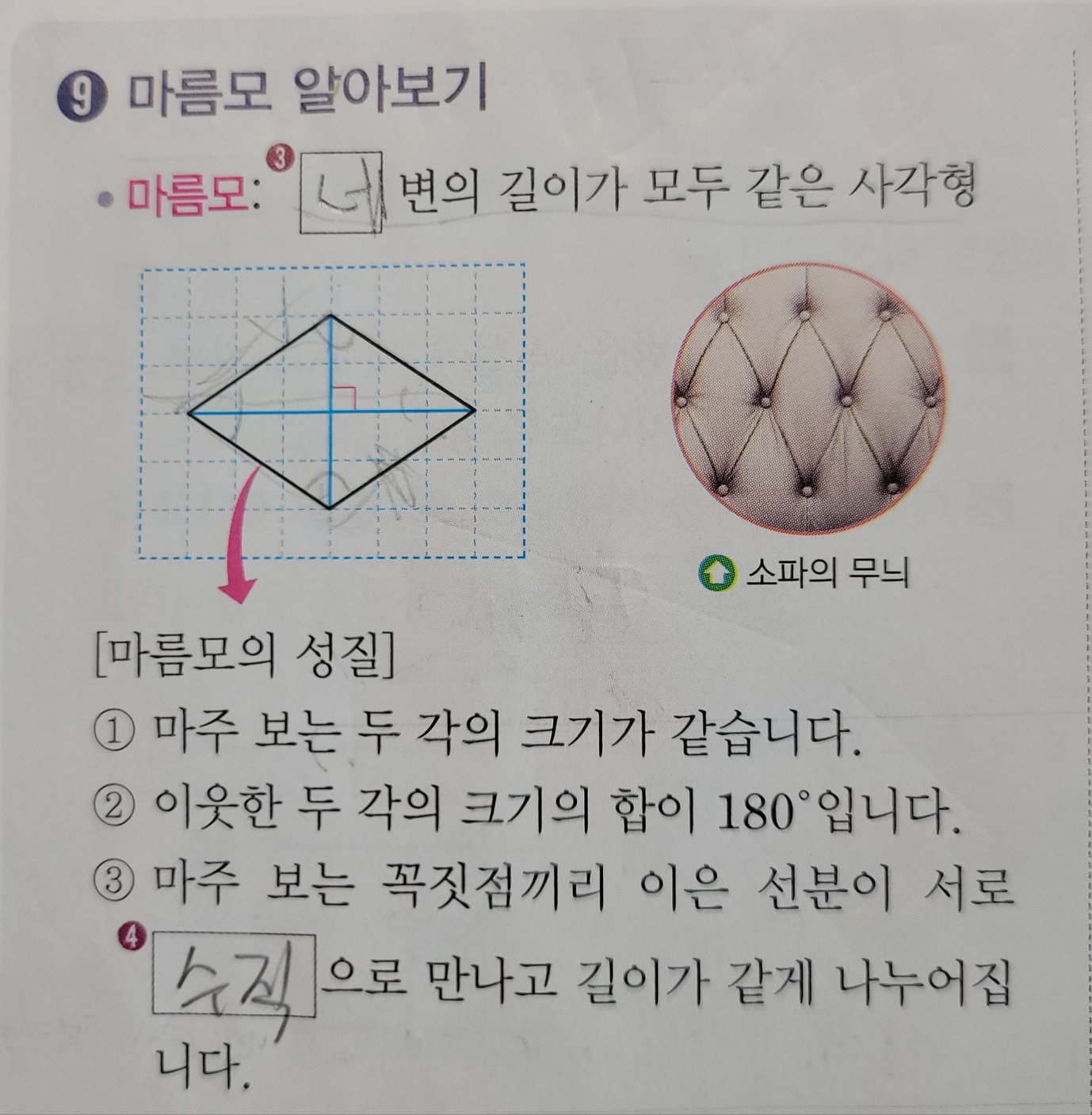 마름모 : (네) 변의 길이가 모두 같은 사각형