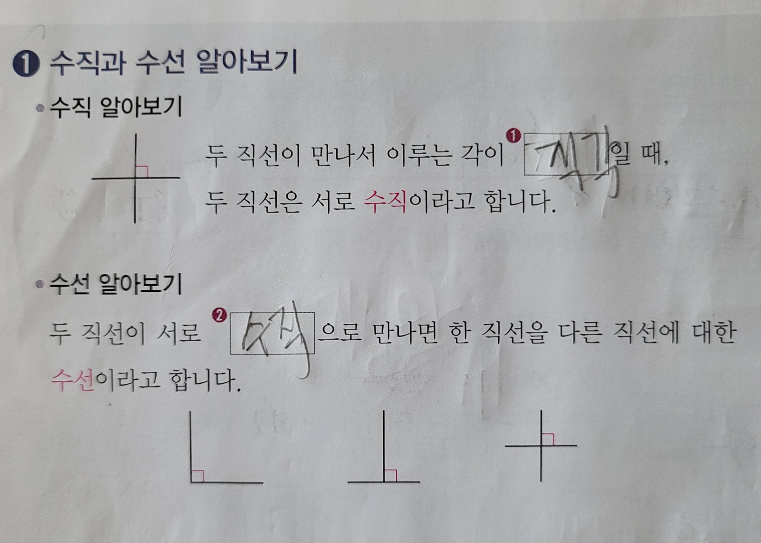 수직 : 두 직선이 만나서 이루는 각이 (직각)일 때, 두 직선을 수직이라고 한다.