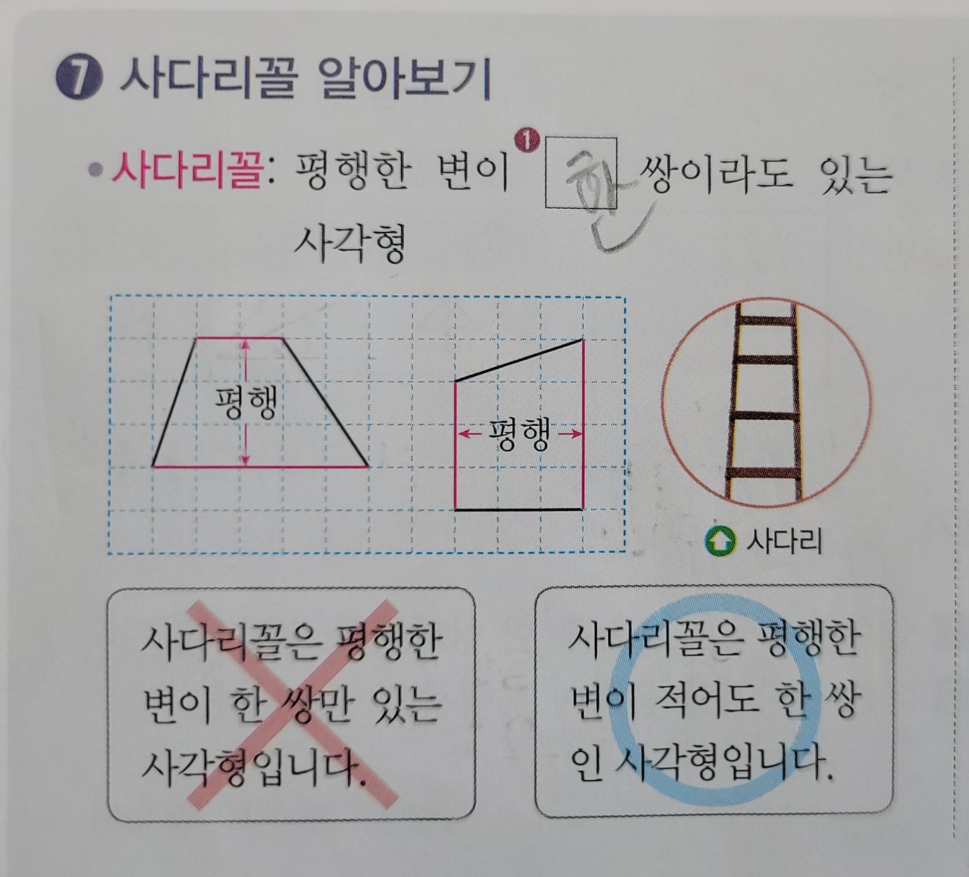 사다리꼴 : 평행한 변이 (한) 쌍이라고 있는 사각형